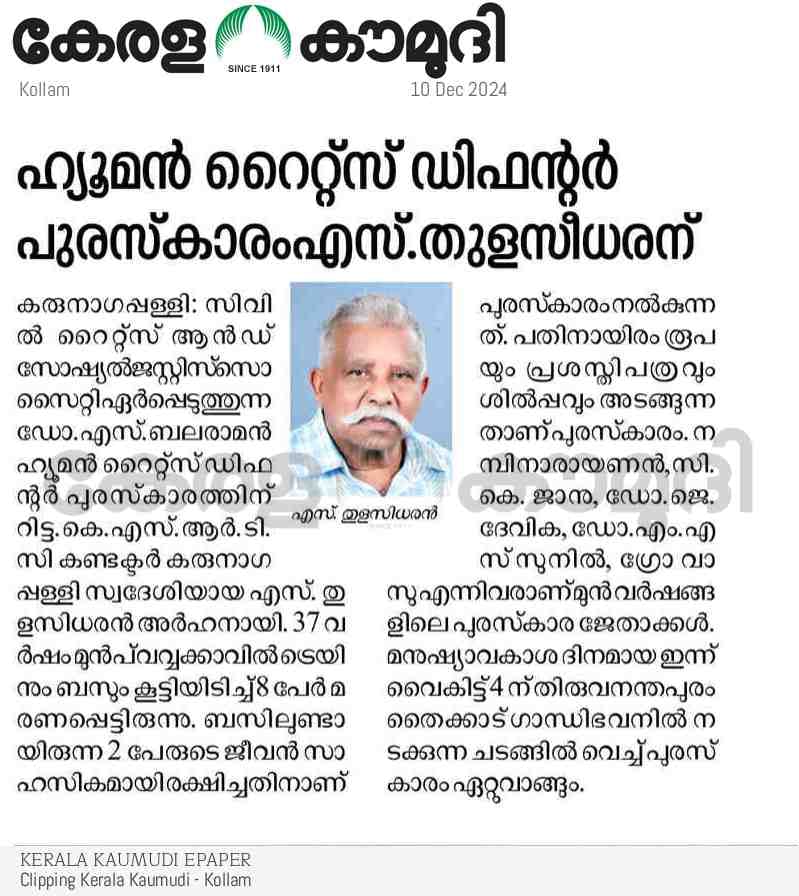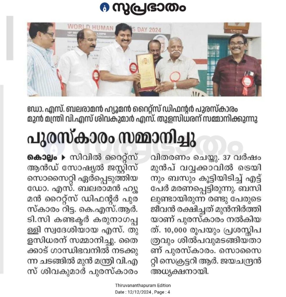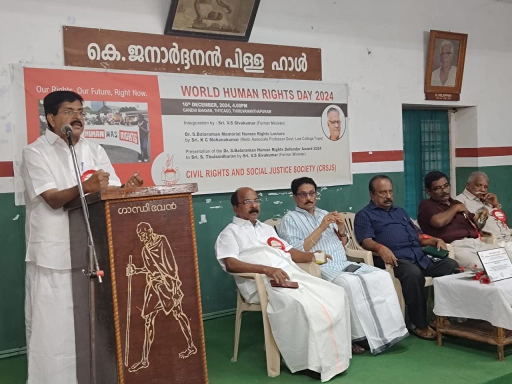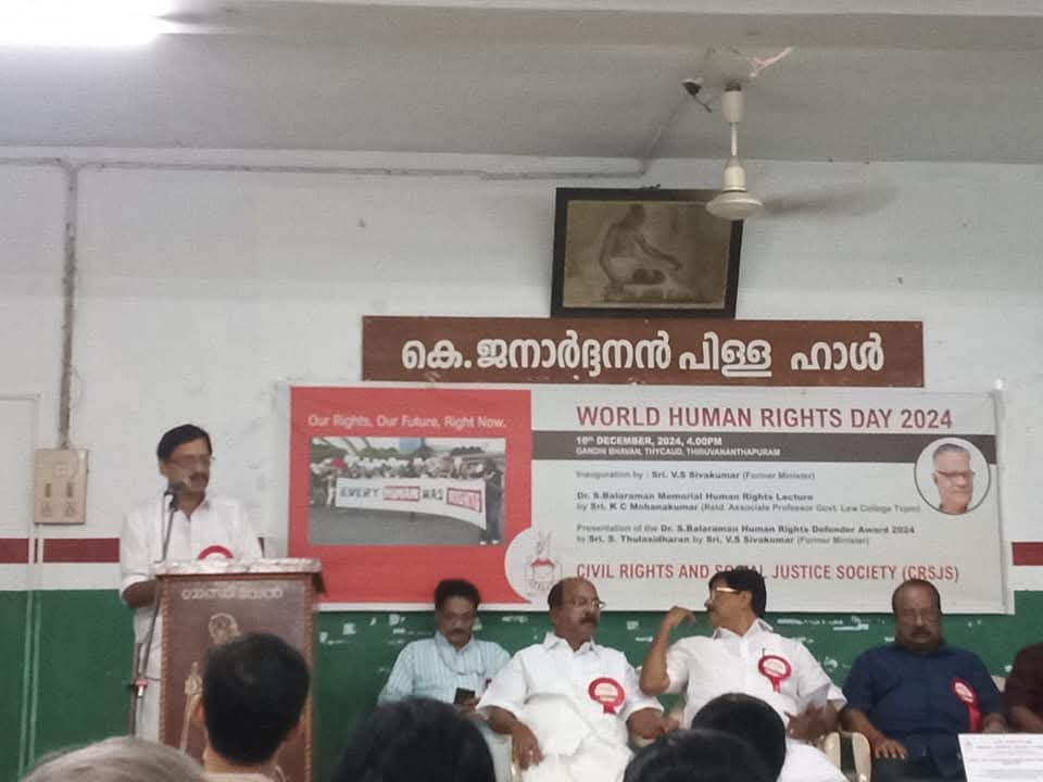 CRSJS – Dr. S Balaraman Human Rights Defender Award. The award consisting of a memento, certificate, and cash prize of ten thousand rupees, is presented annually on the World Human Rights Day to a person who has rendered some outstanding contribution to the cause of human rights. The 10th December World Human Rights Day celebration is a major event in the CRSJS calendar and apart from the award ceremony a distinguished individual is also invited to deliver the Dr S Balaraman Human Rights Lecture on that day.